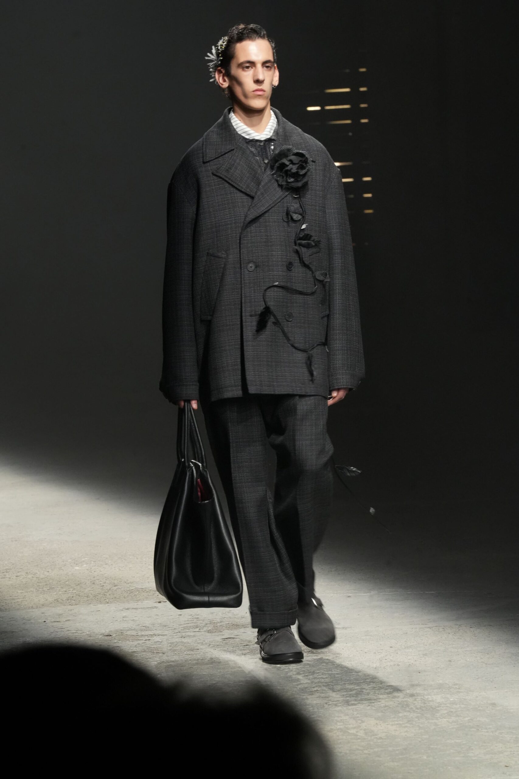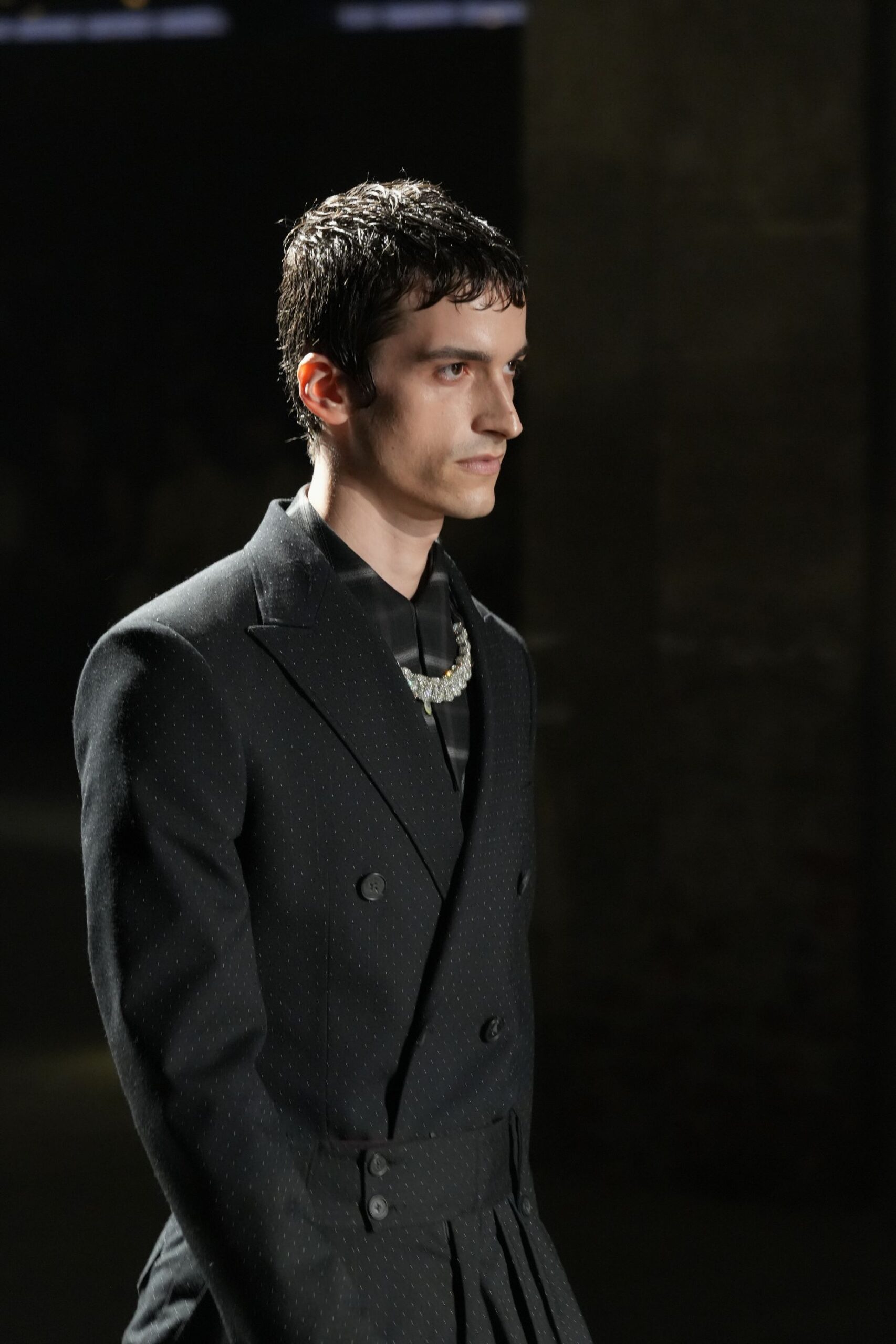 Patchwork buildings, Marras’ signature, were also evident. The designer boldly combines classic patterns like the Prince of Wales check, delicate pinstripes, herringbone, and rich brocades. Such pairings provide depth and complexity to the collection while showcasing his work’s distinct look.