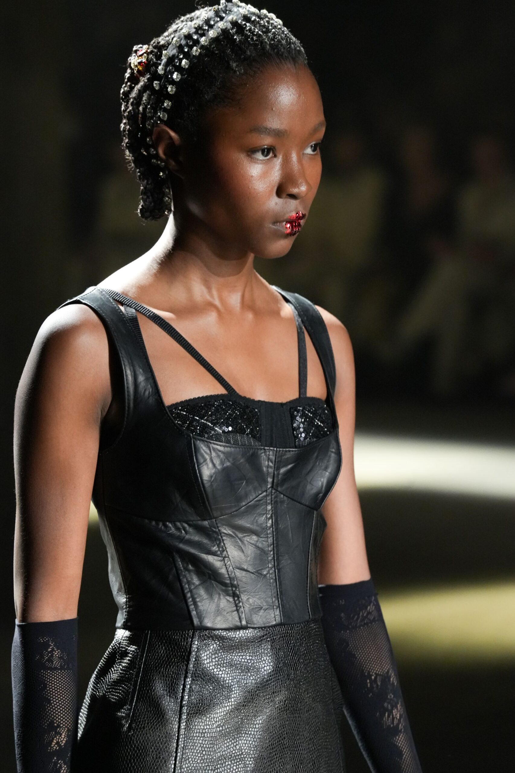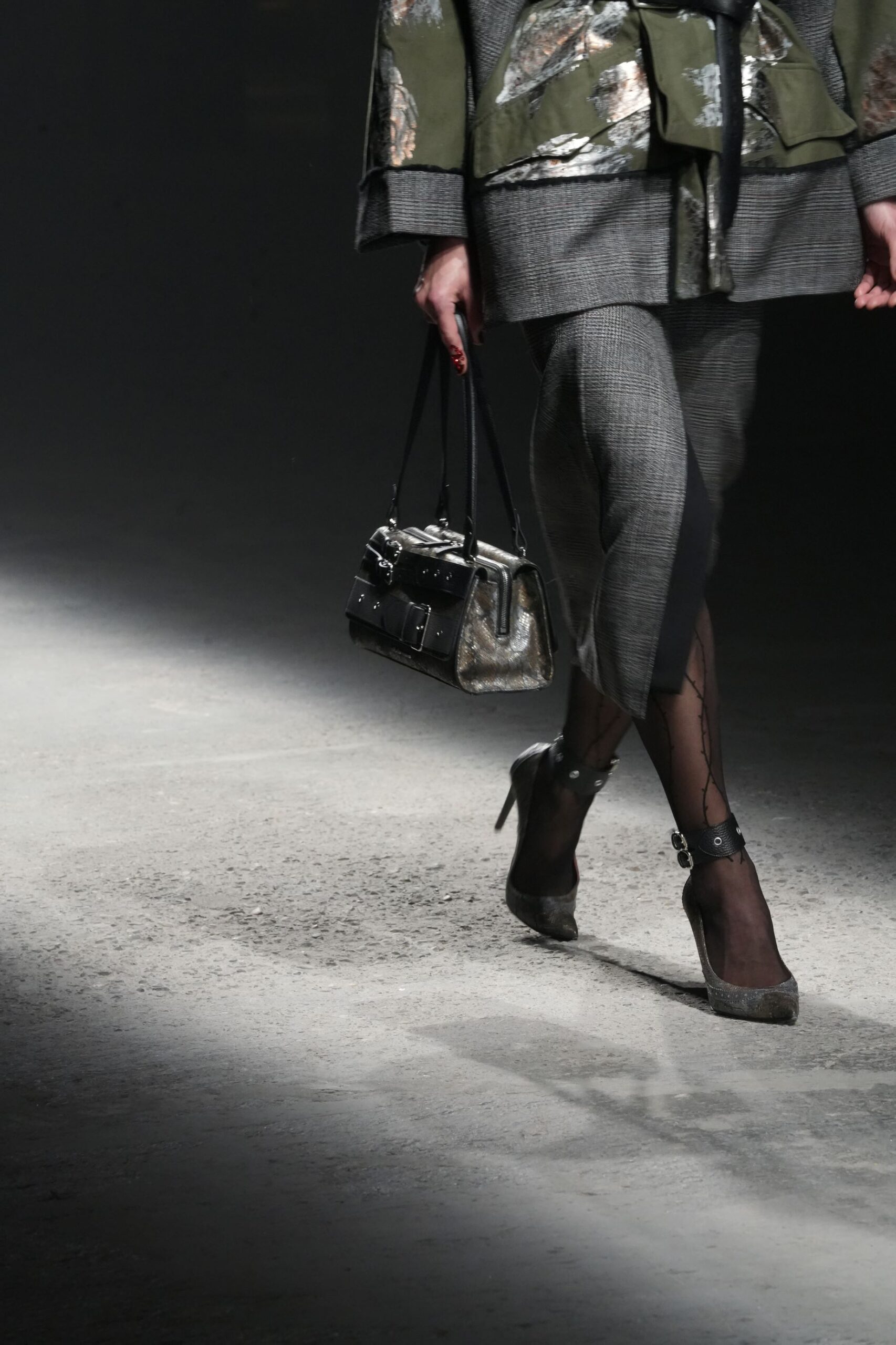 This collection’s distinctive identity stems from its materials and textures. Marras expertly employs contrasts, pairing transparencies with soft velvets, embroidery with appliqués, and glittering sequins with traditional tweed. Structural overlays, patches, and patchwork features give depth and dynamics, highlighting the drama derived from theatrical narrative.