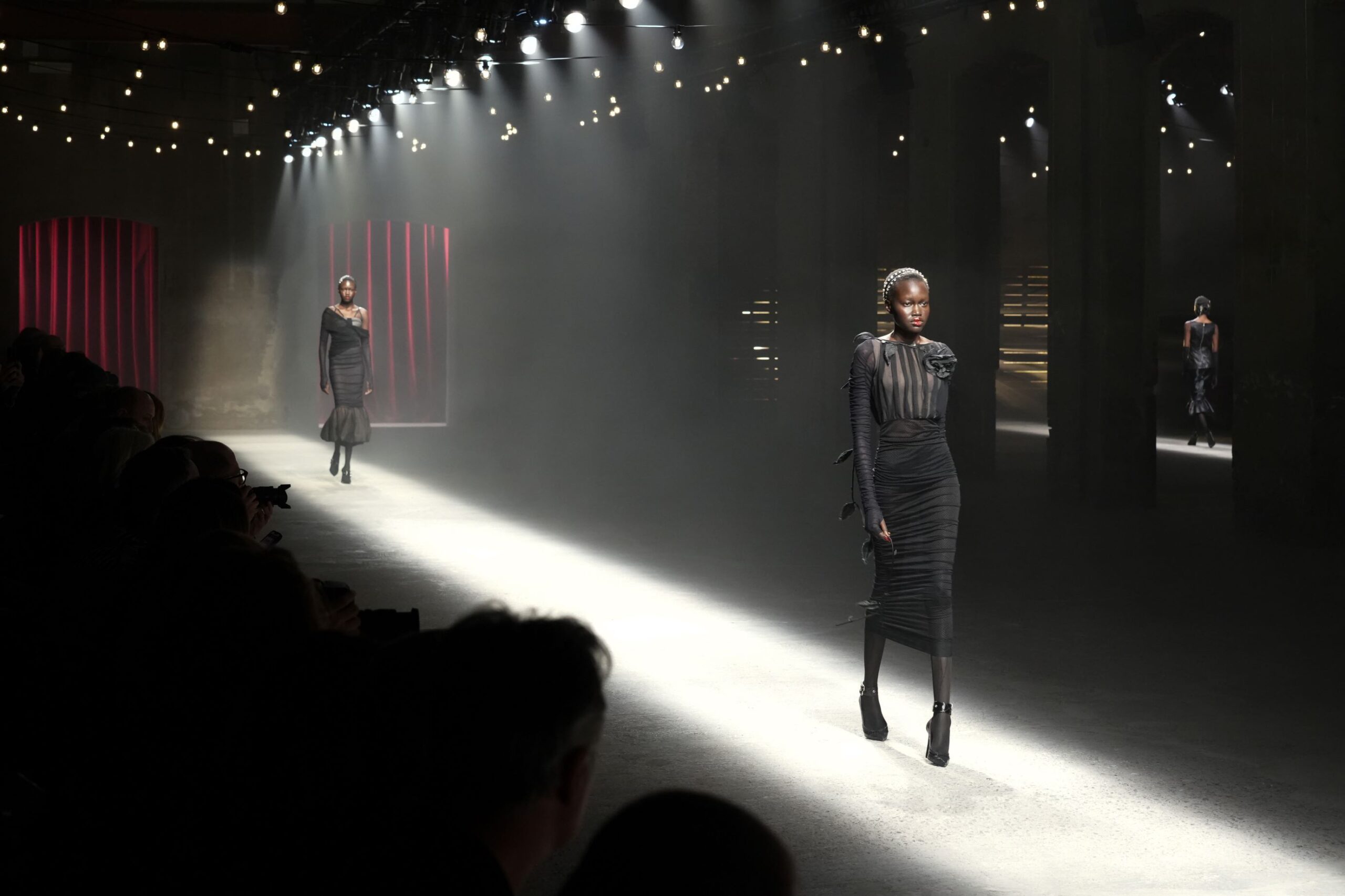 Marras’ work is defined by a blend of classic elegance and artistic narrative, and the exhibition in an empty industrial area allowed for complete focus on the exquisite details of his creations. Marras’ collection celebrates femininity, sensuality, and sophistication via black and fitted silhouettes.