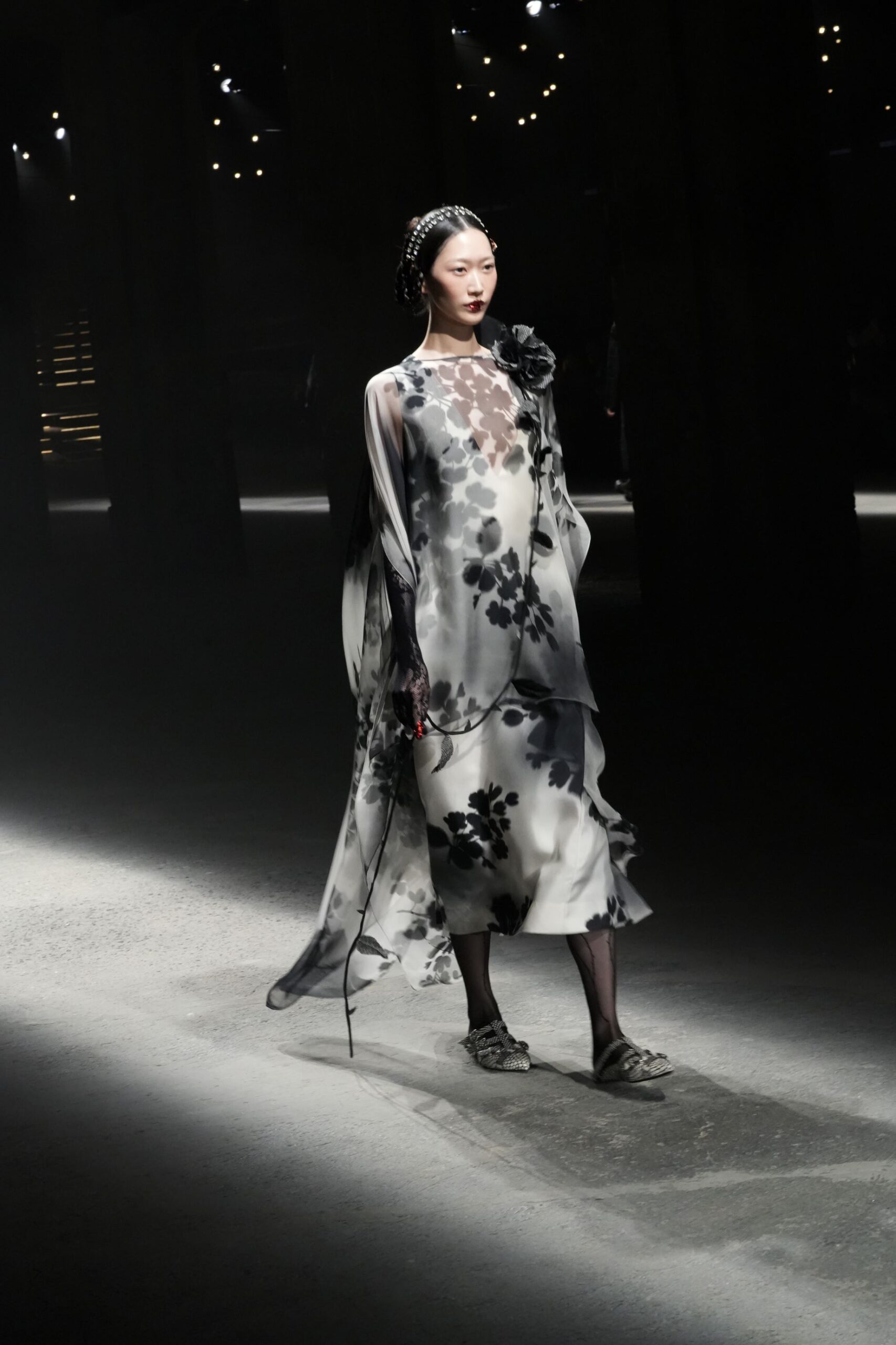 Marras, an artist by trade, incorporated pictorial aspects into his collection; his drawings, sketches, and brushstrokes appeared on column dresses, lending them a personal, almost intimate feel. In contrast, delicate chiffon dresses embellished with lovely flower designs lent lightness and fleeting poetry to the collection.