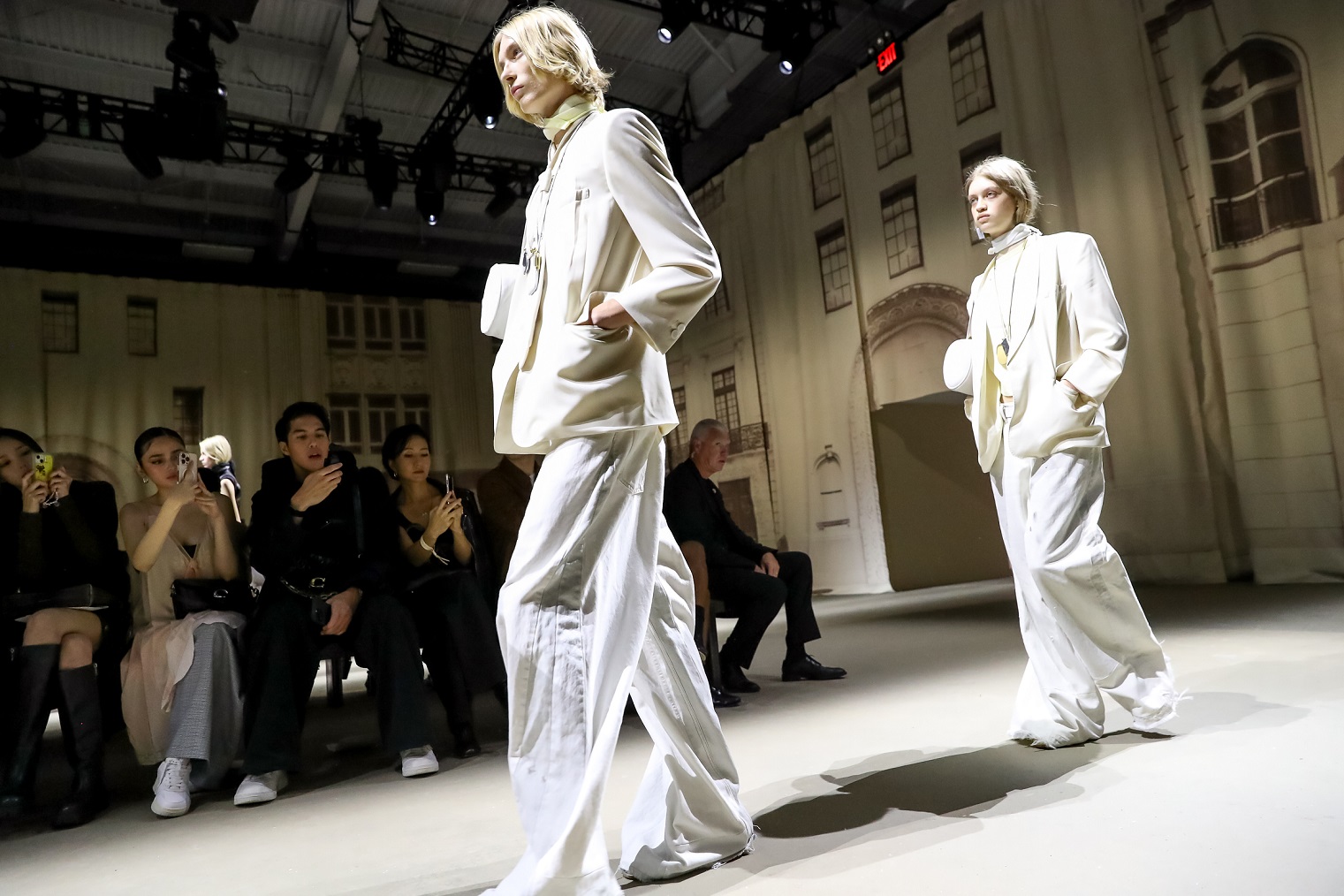 Guests at the show were ushered through a darkened space and into the main presentation area, which was entirely surrounded with sepia canvas scrims depicting the grand facades and open vistas of New York City. Awash in light and stark shadow, the backgrounds presented the models as though they were traversing the streets of the city, part of the continuous parade of urban life.