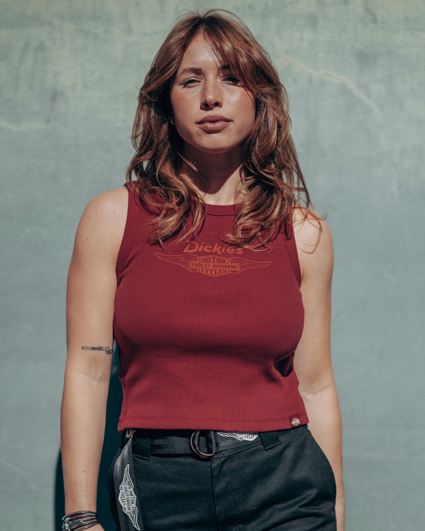 Dickies x H-D Winged Bar & Shield Ribbed Tank – Staying cool is as easy as looking cool in the Dickies x H-D Winged Bar & Shield Ribbed Tank. Made from 100% breathable cotton that’s ribbed for a textured look, the slightly cropped silhouette features signature Dickies branding and the Harley-Davidson 1930s Silver Wing logo.
