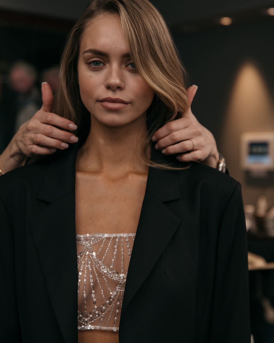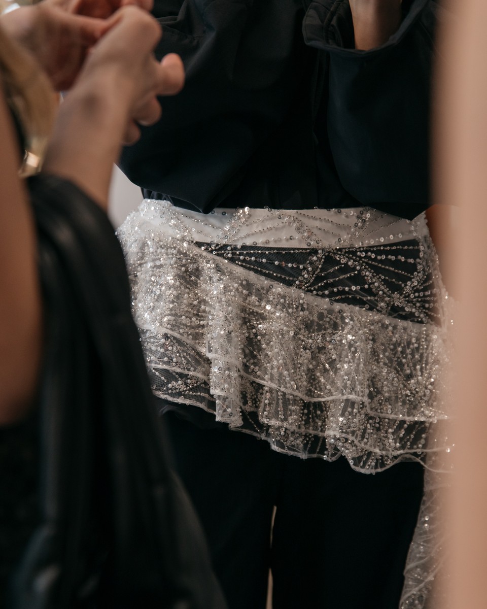 Timeless elegance, restraint, draped jerseys, elegant dresses, and structured jackets were showcased by Marina Moscone. Finally, Libertine embraced ornamentation, transforming architectural motifs into richly embroidered coats and gold tweed fabrics, balanced with calmer knitted patches.