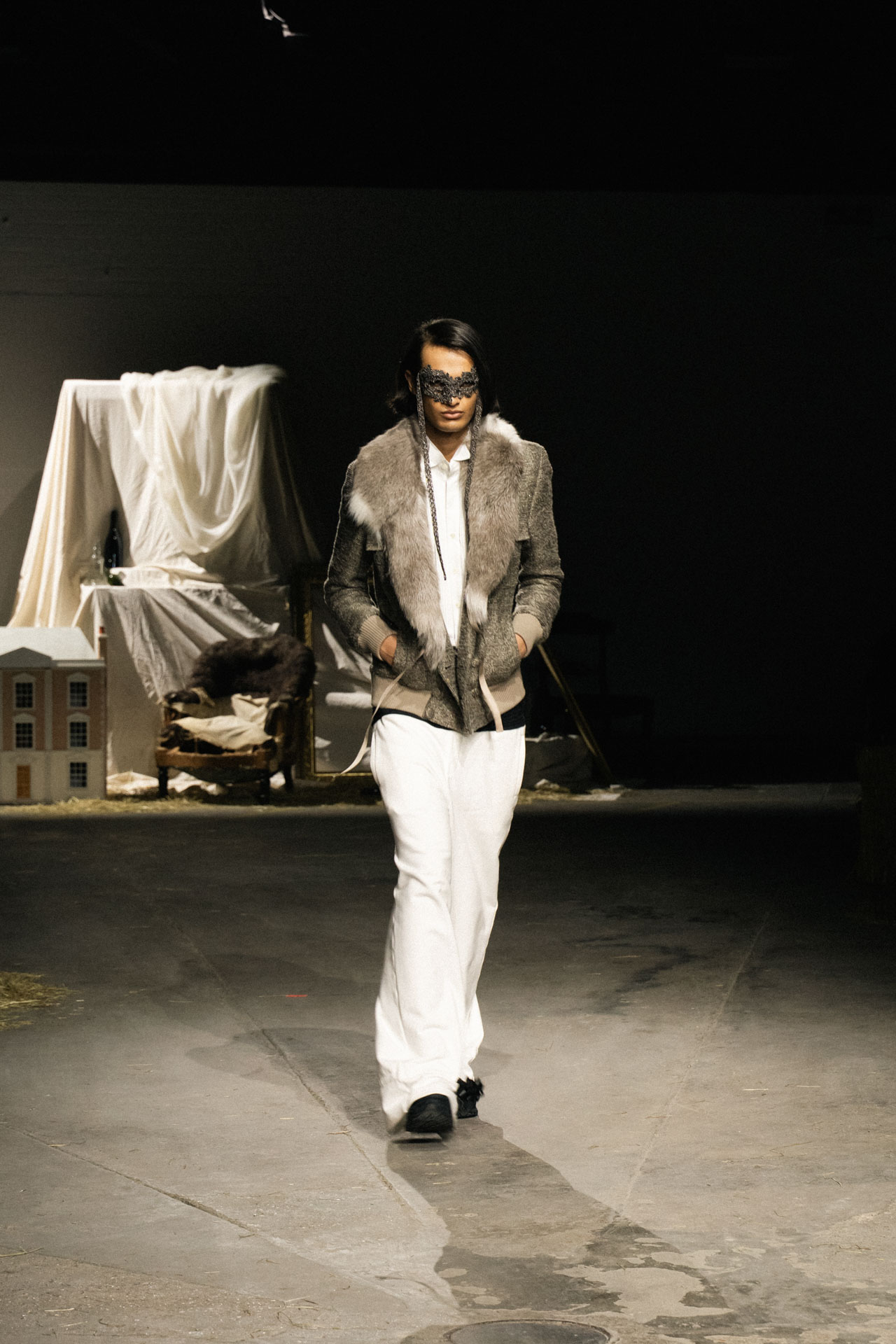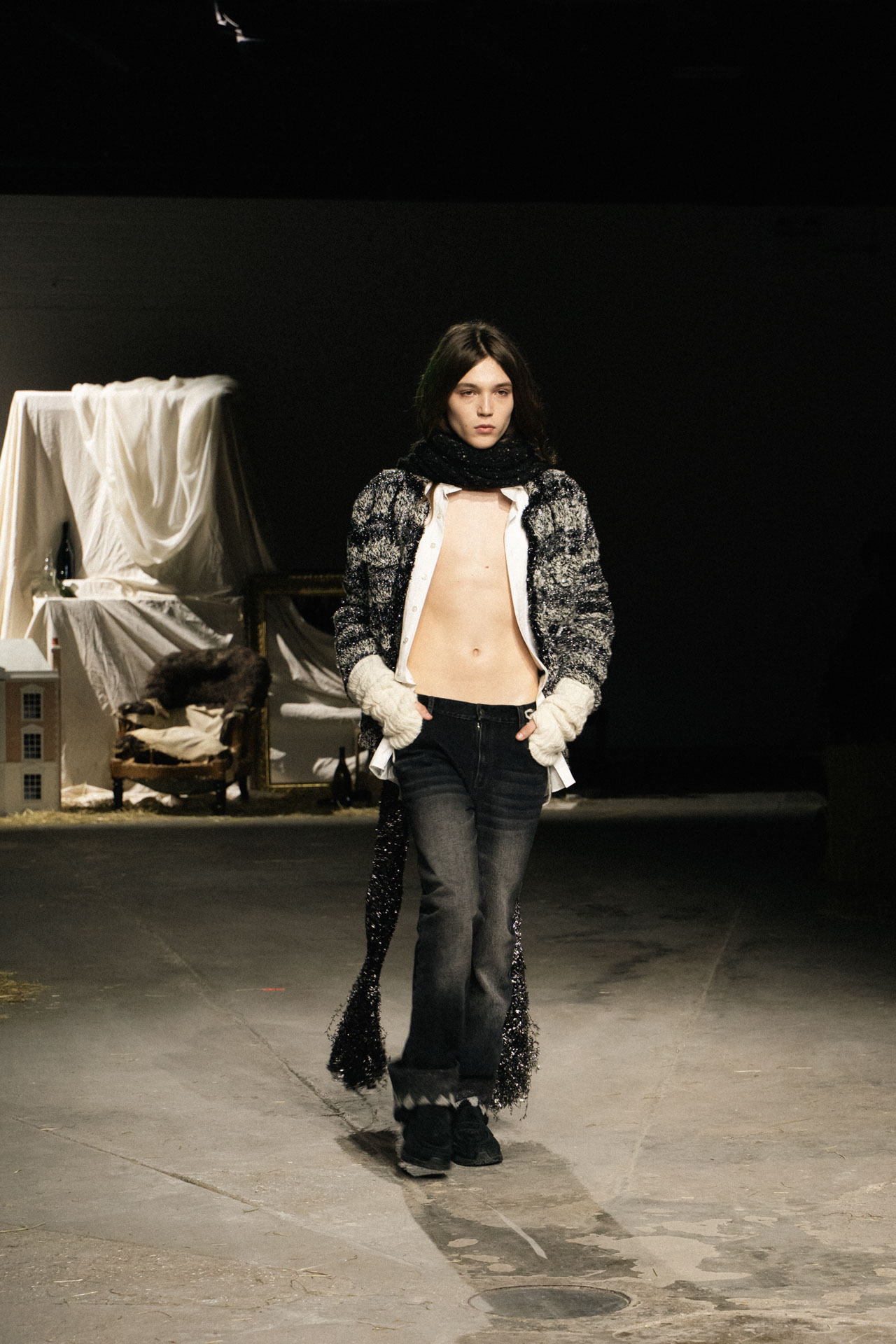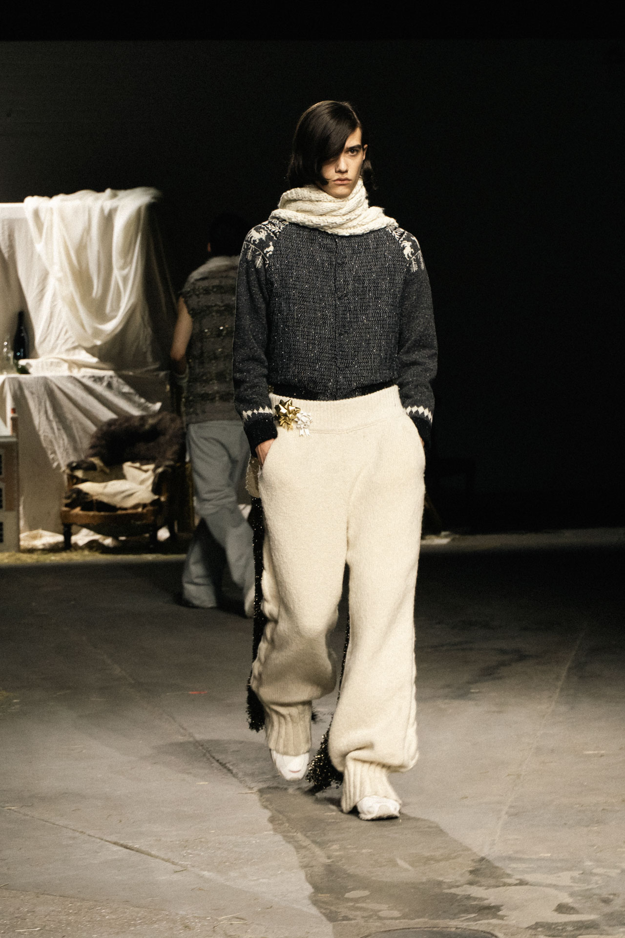 Aristocratic sophistication, ascetic almost medieval scenography, wooden cabinets decorated with mirrors, a combination of fashion and immersive theater, knitted accessories and luxurious touch define Oscar Ohuyang’s collection.