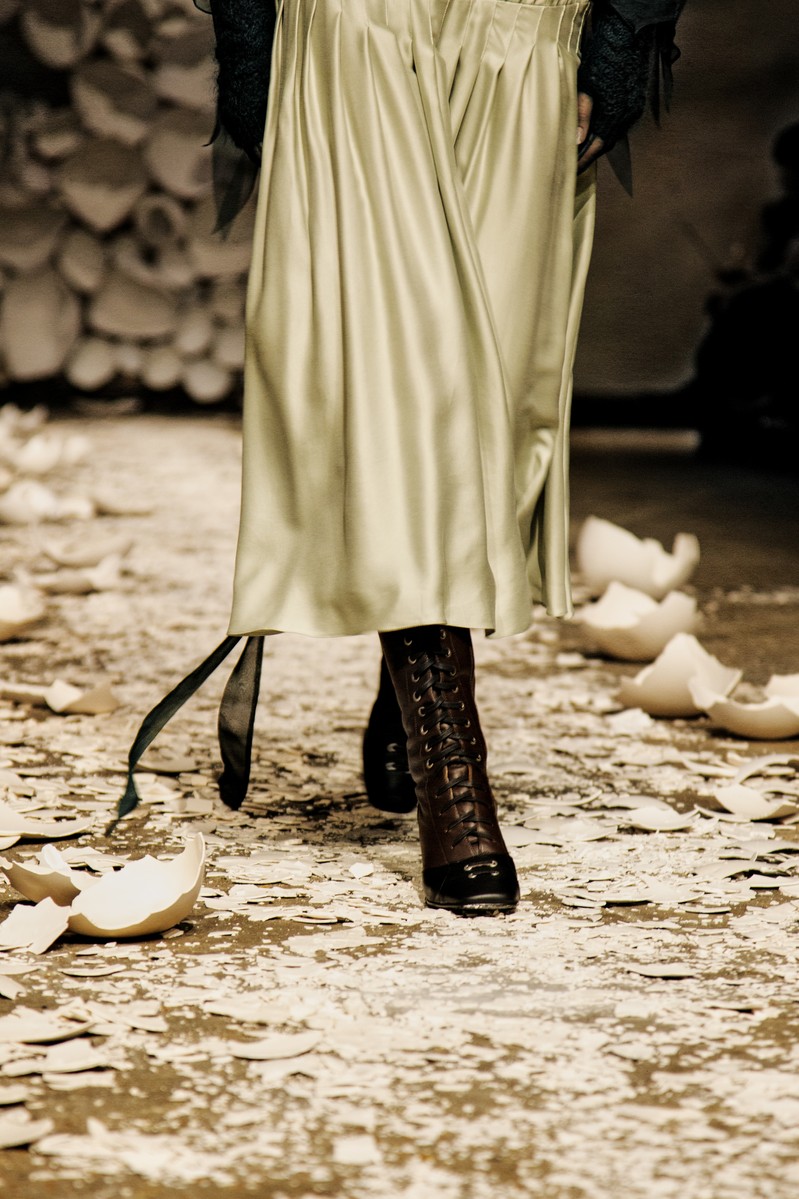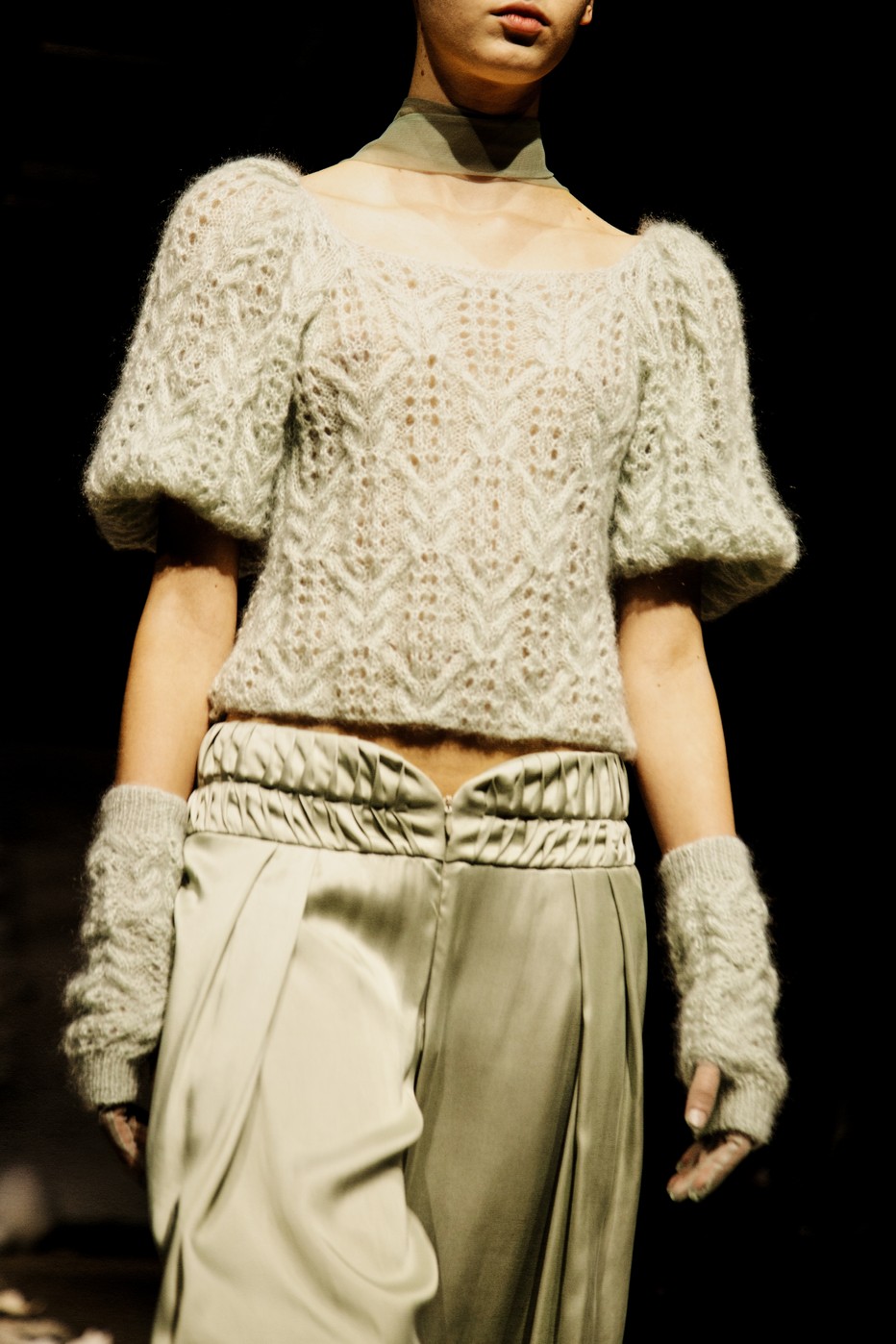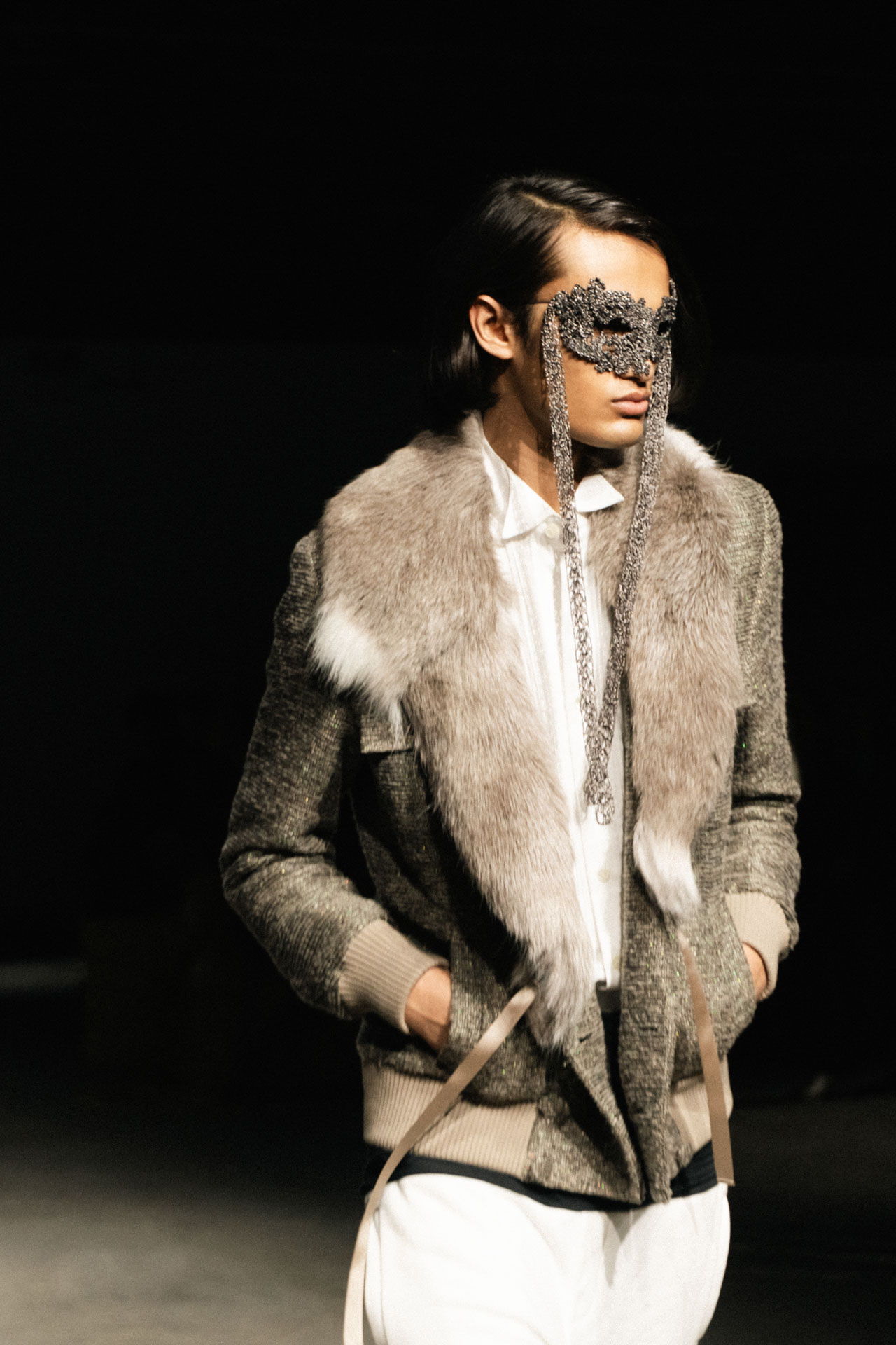 Aristocratic sophistication, ascetic almost medieval scenography, wooden cabinets decorated with mirrors, a combination of fashion and immersive theater, knitted accessories and luxurious touch define Oscar Ohuyang’s collection.