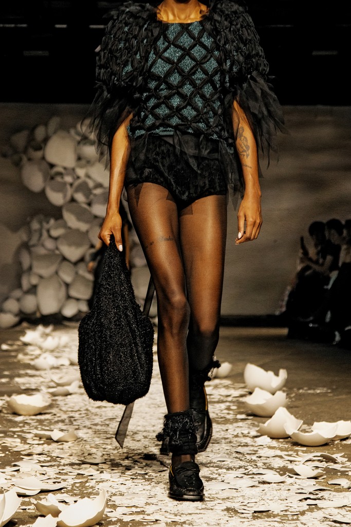 The atmosphere of a dark autumn forest, corset and tailoring art combined with tinsel and crystal textiles boldly merged, created the unforgettable atmosphere during the Agro Studio Runway Show. Definitely echoing Chanel’s iconic autumn forest runway of 2018 by Karl Lagerfeld, much more than this year’s forest and mushroom themed Haute Couture debut of Matthieu Blazy.