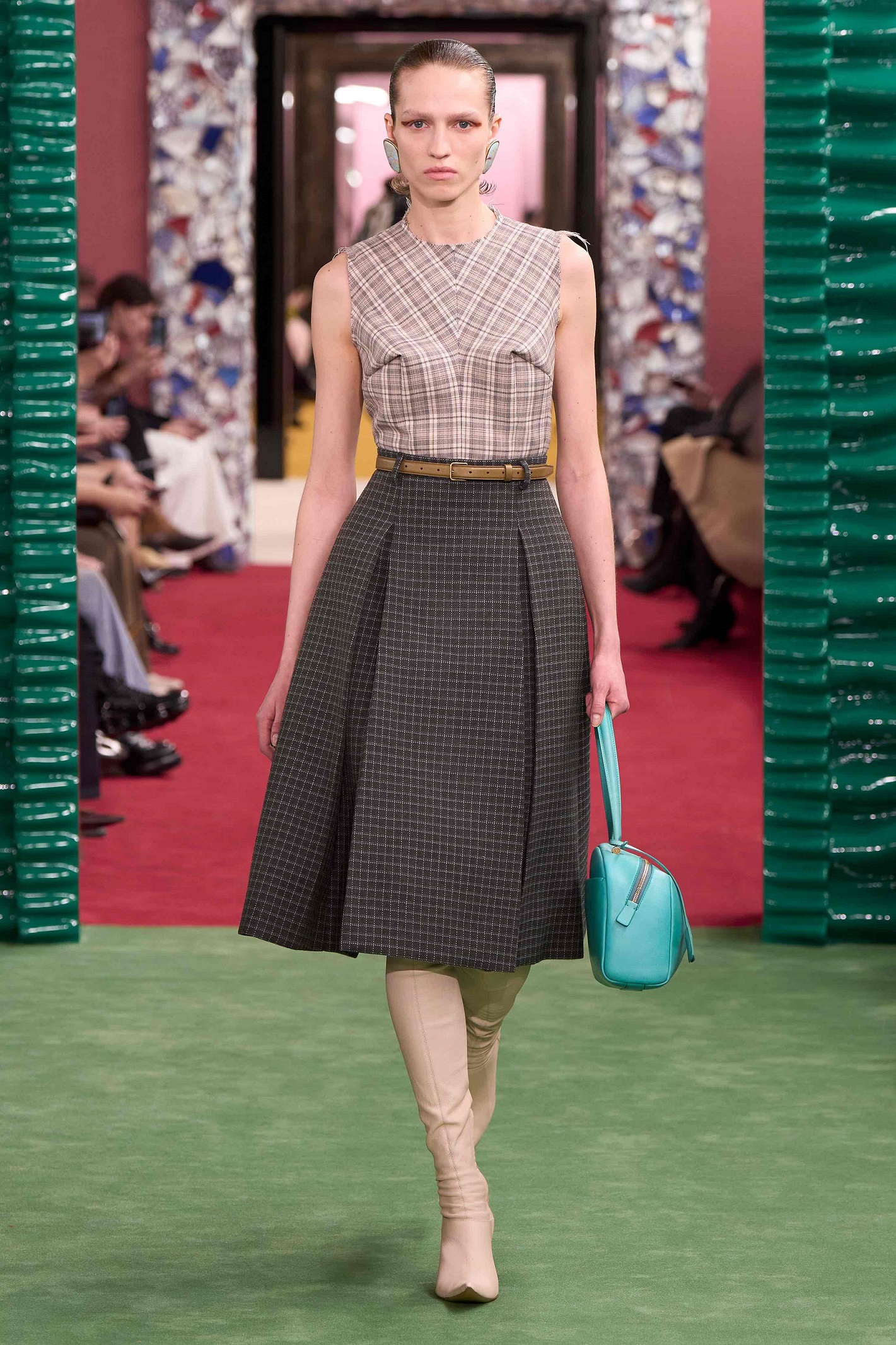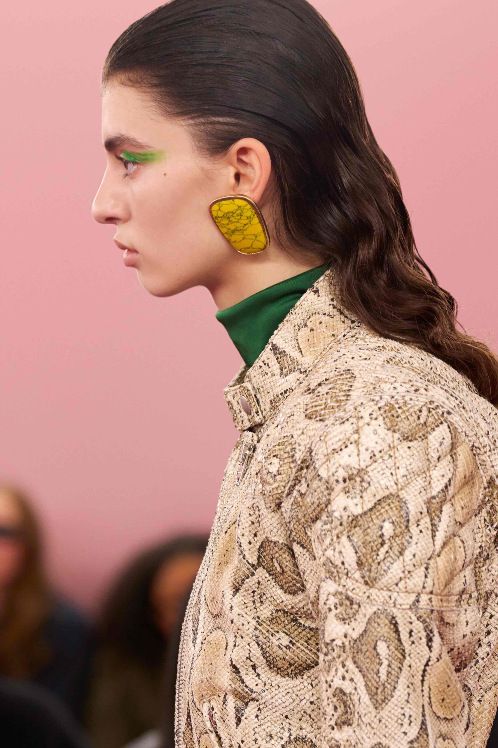 The accessories in this collection serve as staples of aesthetic expression, adding character and drama to the looks. They function as bold accents that enhance the silhouette, set the mood of the collection and reveal individuality. The bent pointy toe defines pumps and stretch boots in suede and leather that climb up the legs, some with furry accents. Eyewear puts a streamlined slant on vintage styles with lenses in vivid tones that accentuate the composite character of these women. A new bag shape is structured with a single handle for an eccentric tilt, and the Camero returns in weekender size.