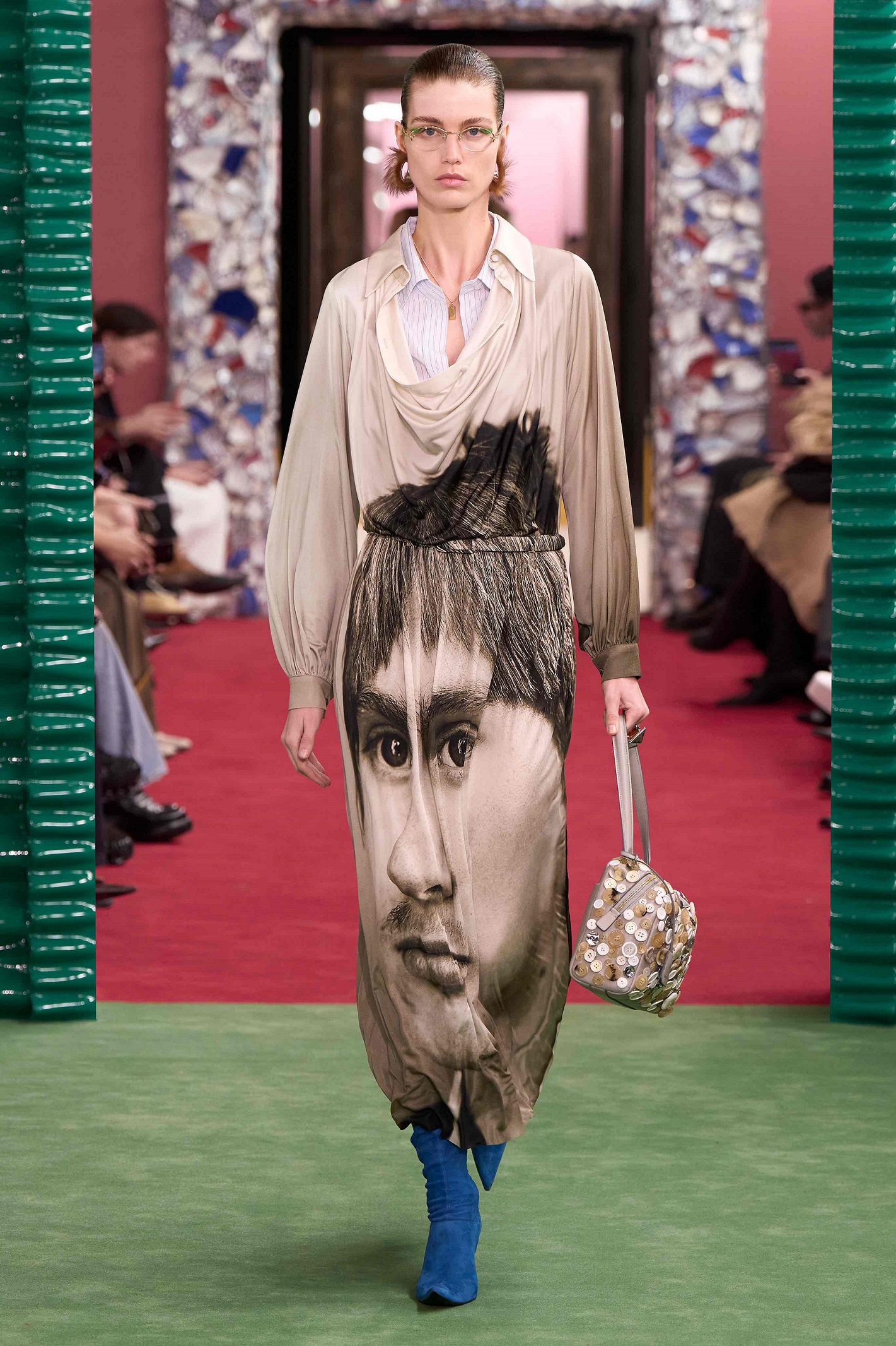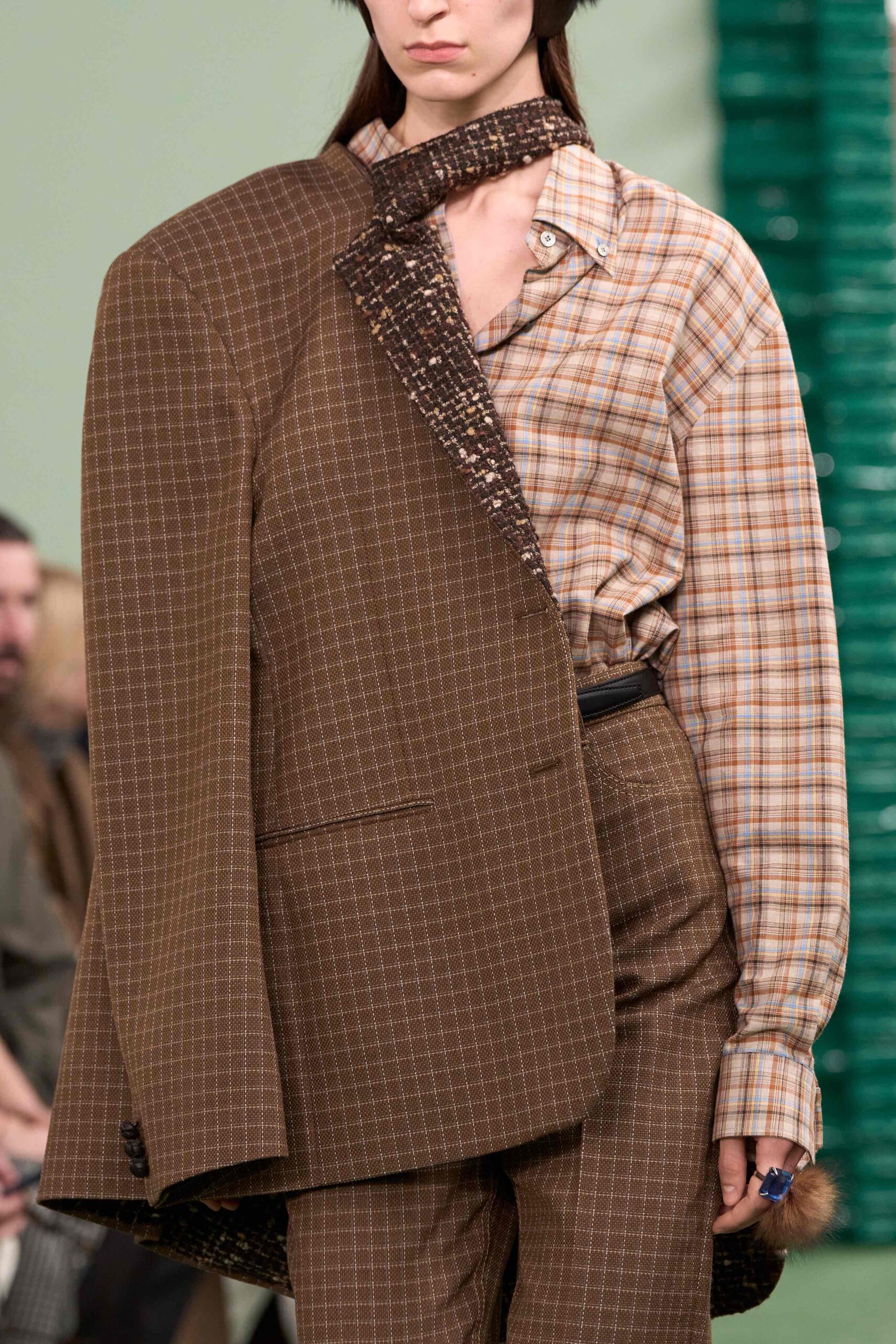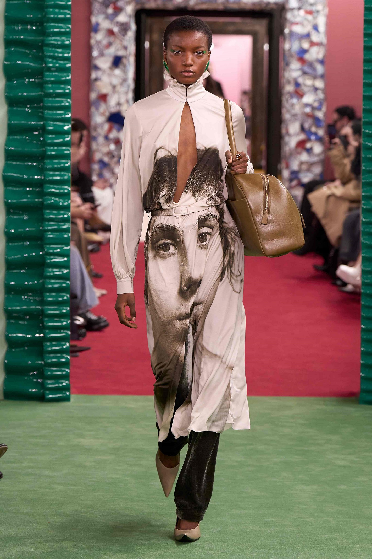 Traditional patterns are reimagined and transformed through the lens of contemporary design. At the same time, they preserve the spirit of tradition, lending the collections depth, individuality and cultural significance. Prince of Wales checks shift in scale, placement and colour – from dusty to darker tones; hortensia motifs in technical satin resemble tapestry and animal patterns are abstracted. Elegant silk scarves are now playfully extra-long in classical motifs and collaged prints. The larger-than-life faces are from Paul Kooiker’s portrait series of art school students, presented at Acne Paper Palais Royal last year. A reminder that Acne Studios is anchored in the idea of creative collective.