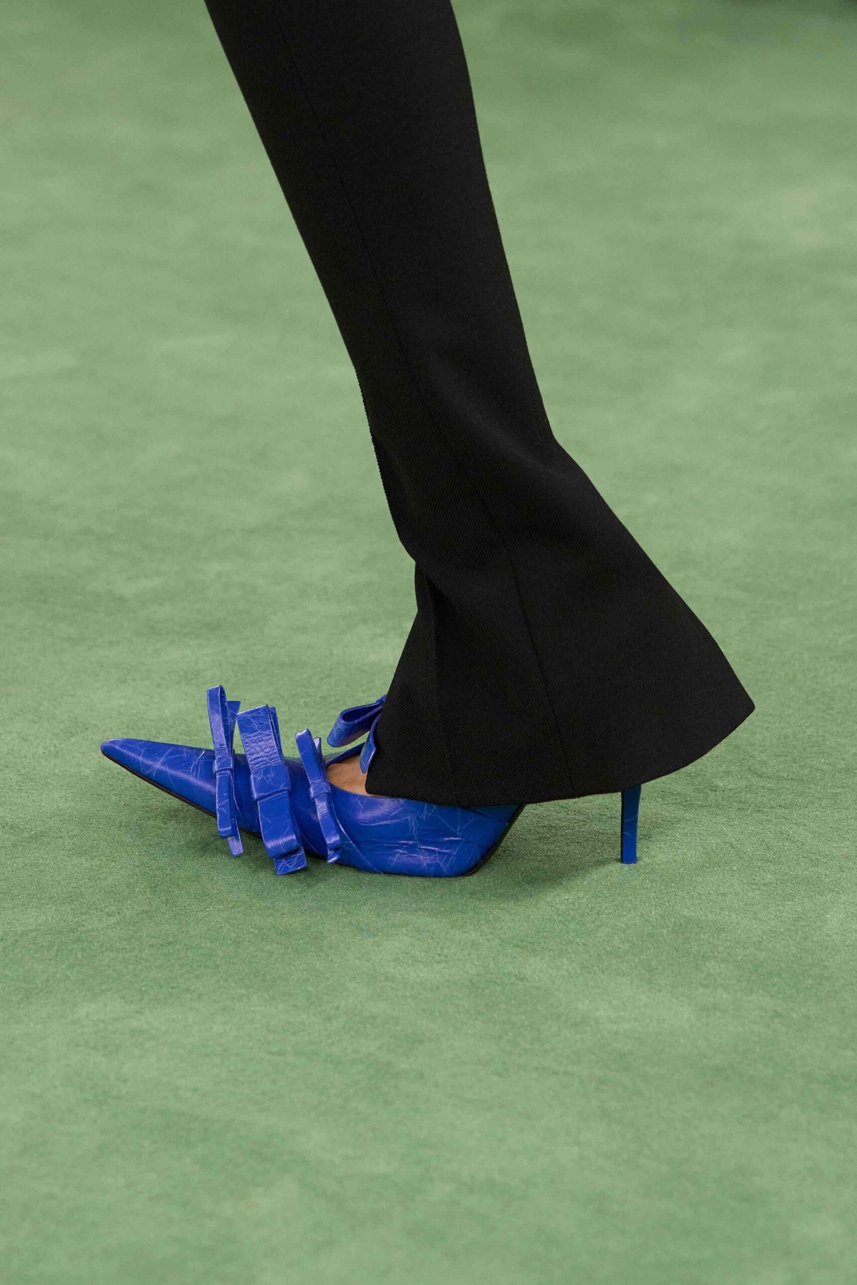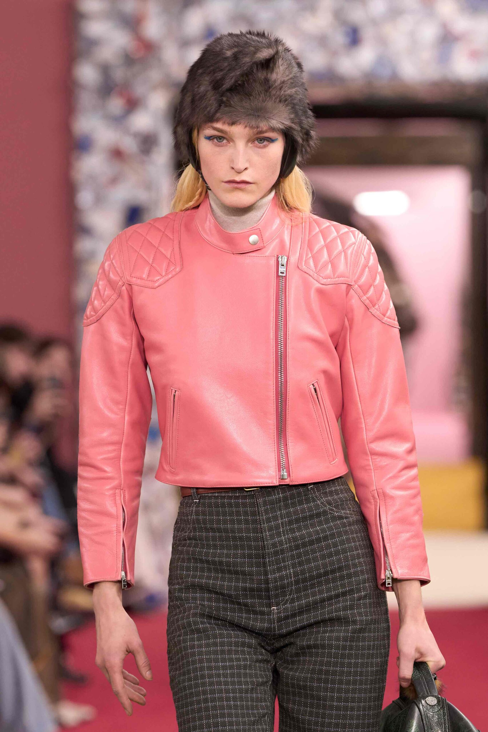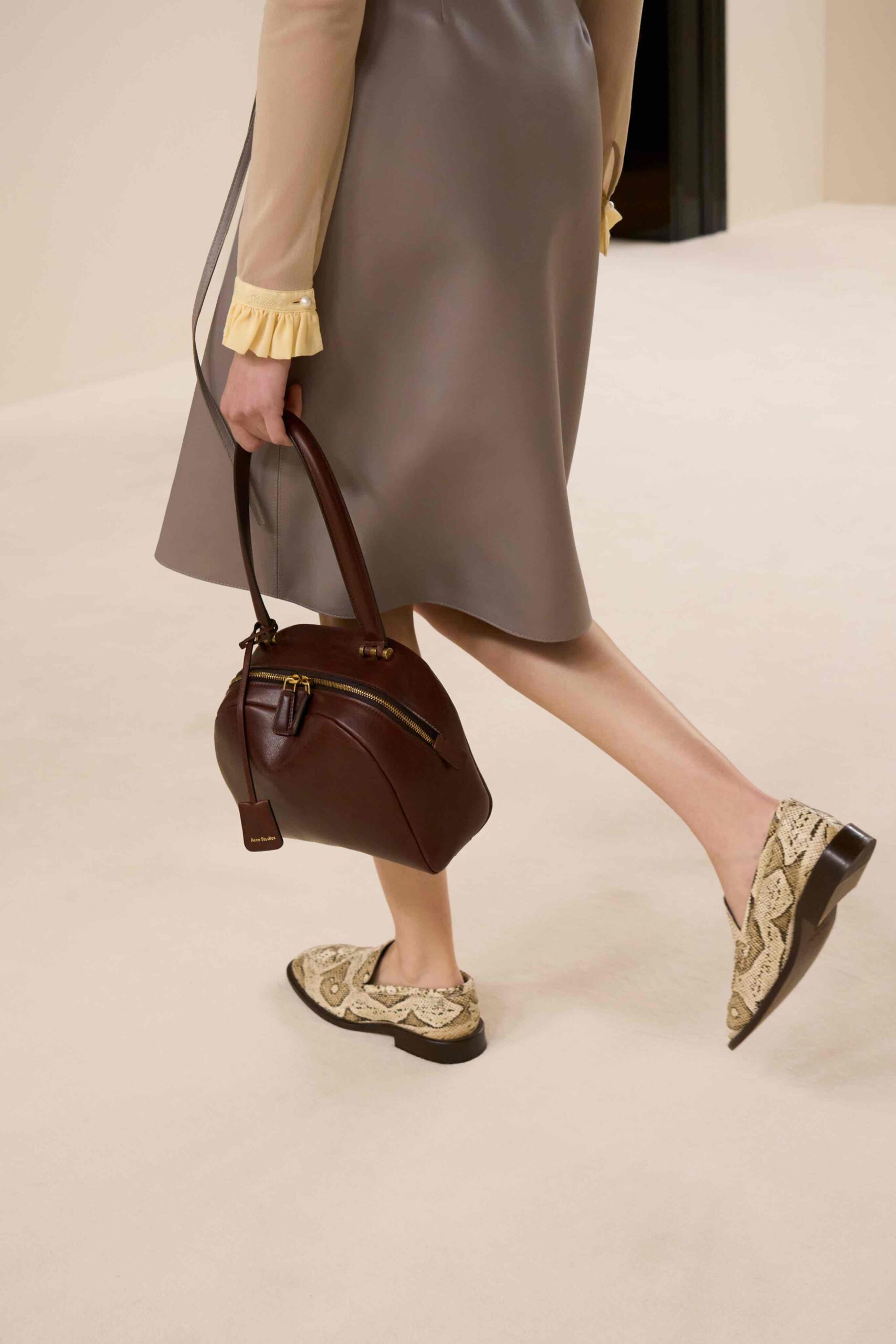 Acne Studios embraces, reaffirms and revisits its signatures throughout the collection. There’s the leather biker or aviator jacket, mainly cropped, fitted and in punchy hues; jeans are slim and tapered, and the classic 1996 cut is revived; tailored jackets are sharp and can be slung across the body; knits are coordinated as preppy sets. A specific approach to layering puts these garments in conversation. The silhouette is convertible and unrestrictive yet anchored by moments of precision. A particular skirt – traditional in shape and length – becomes a character in itself, an emblem of intellectual femininity made contemporary.