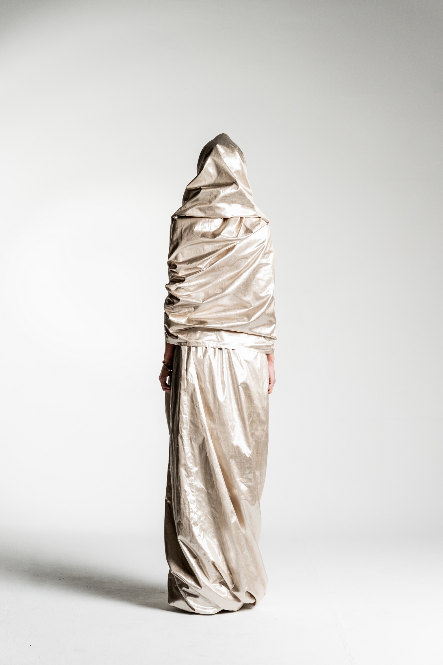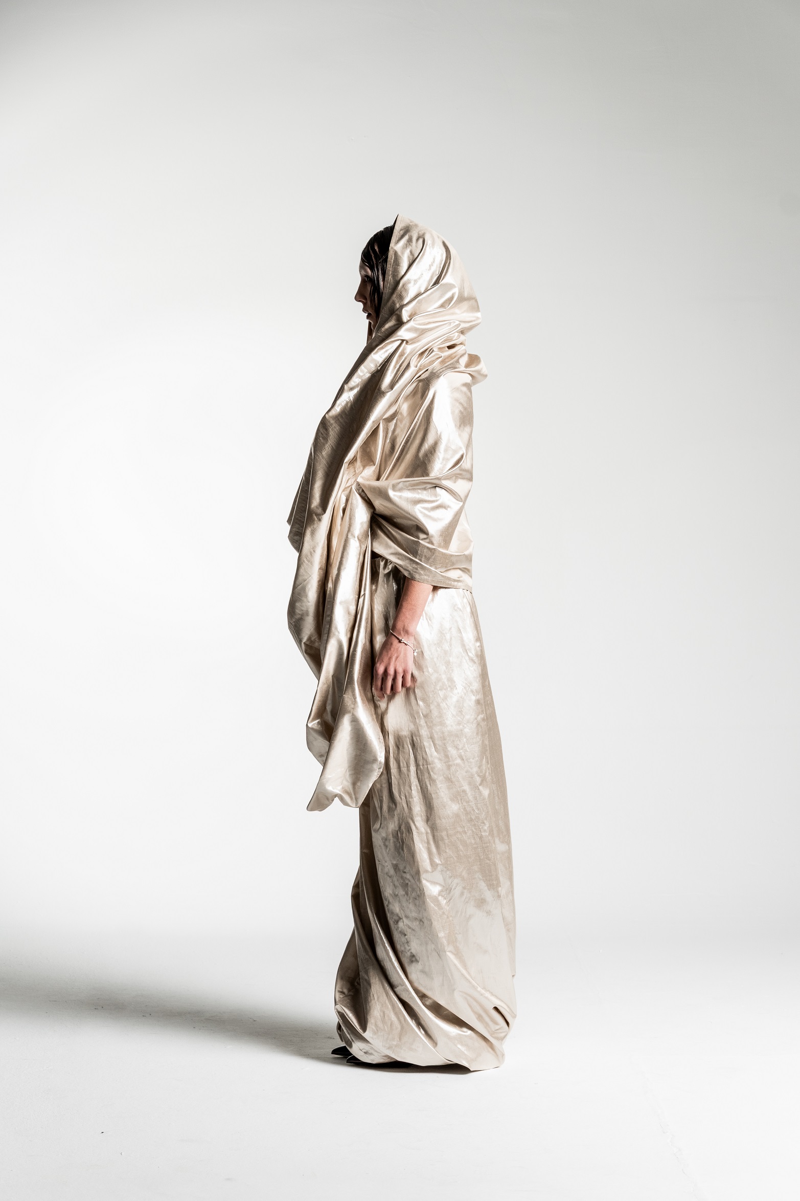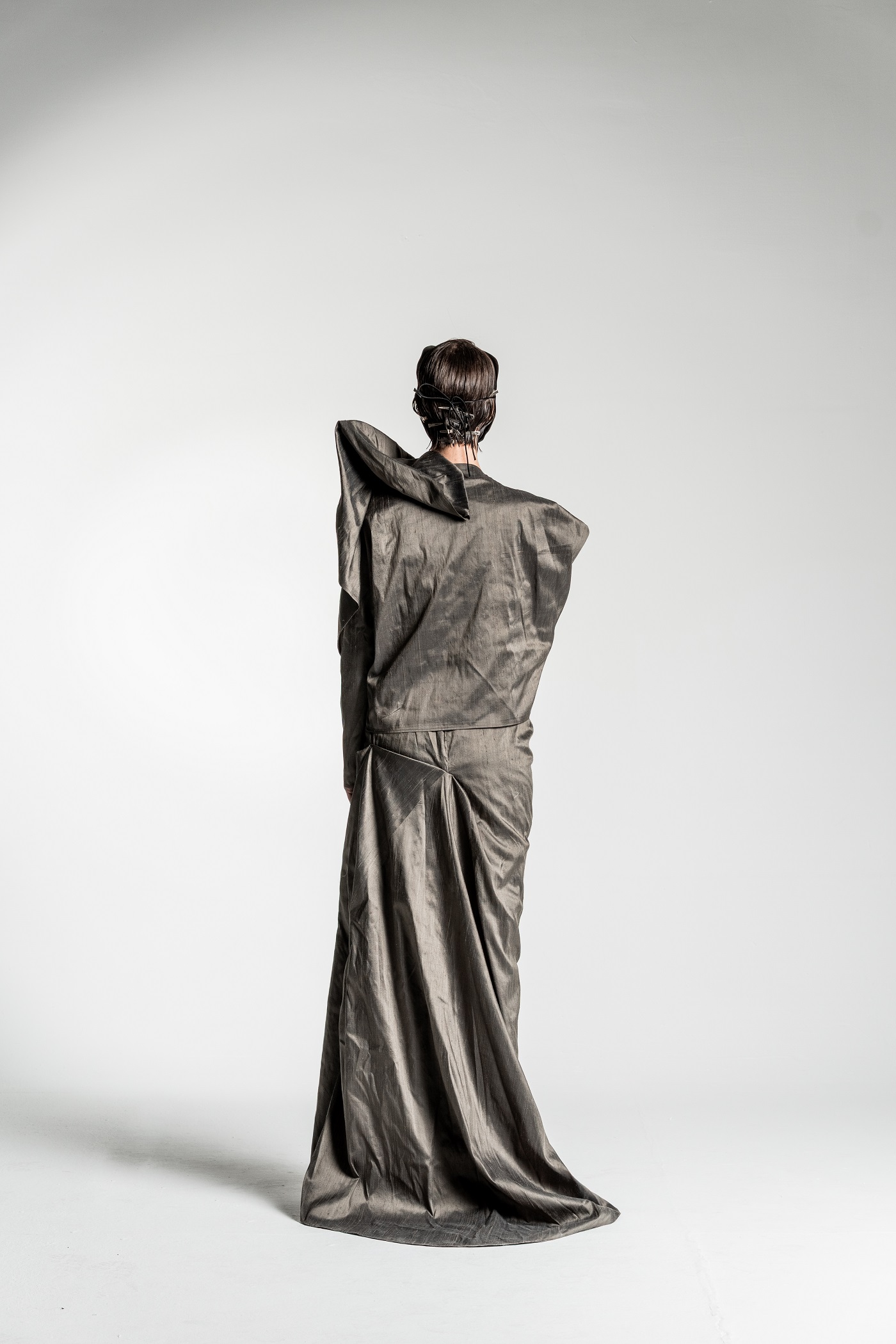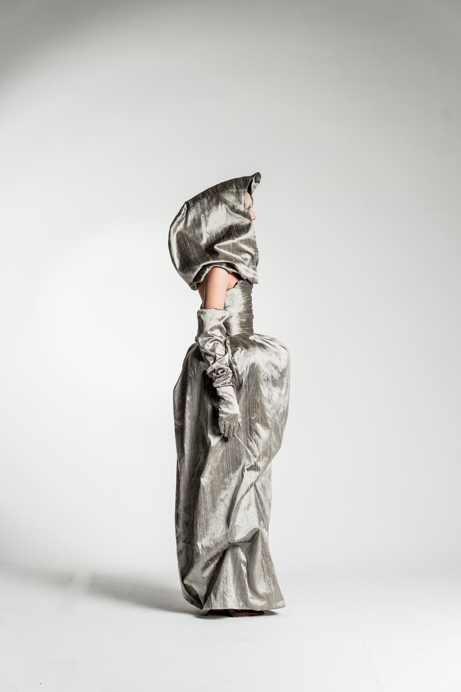 Yes, the collection features a silhouette in silvery-gold tones that is particularly close to my heart and, in a way, best captures the emotional core of the entire project. The shape of this silhouette evokes a cocoon – a symbolic shell that we wear and, at some point, are ready to shed.
