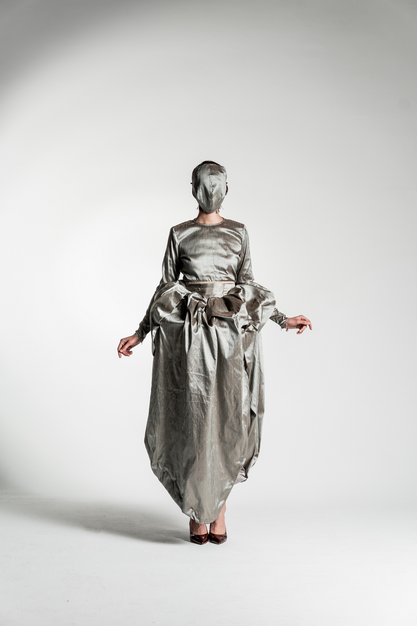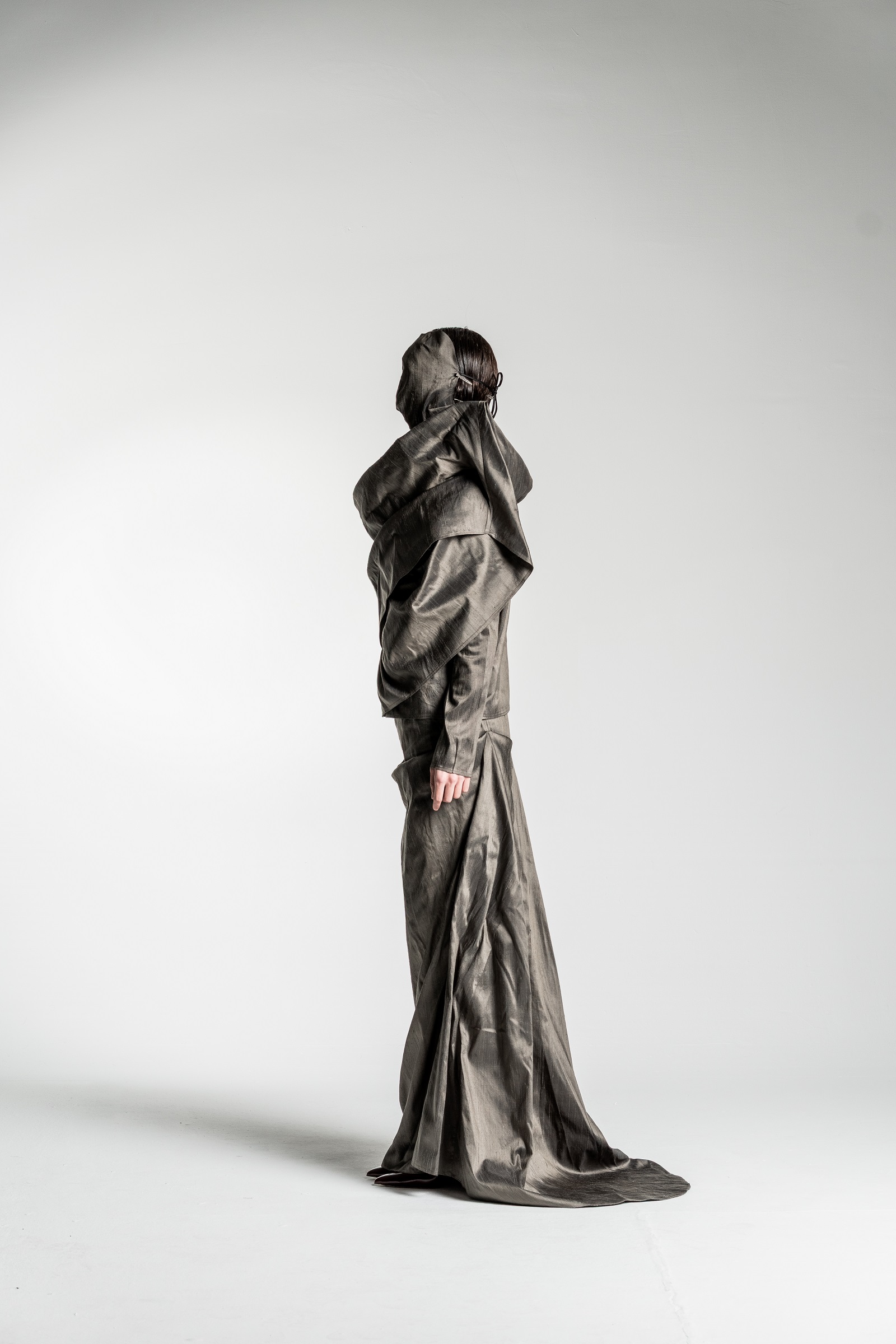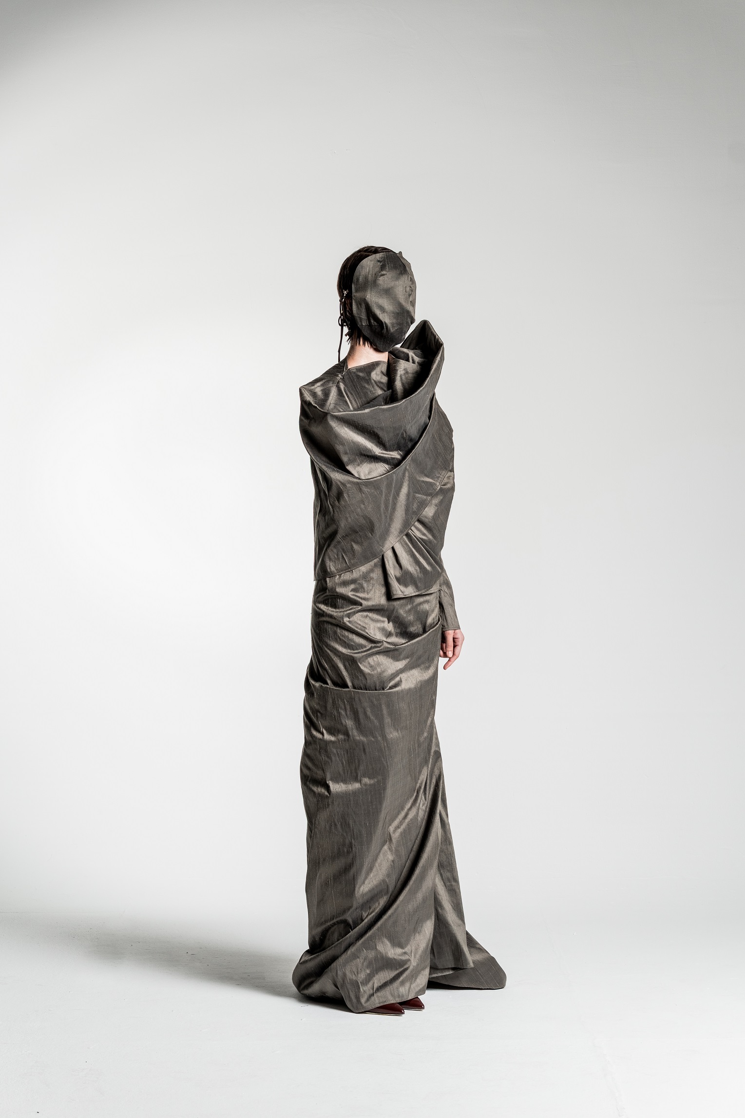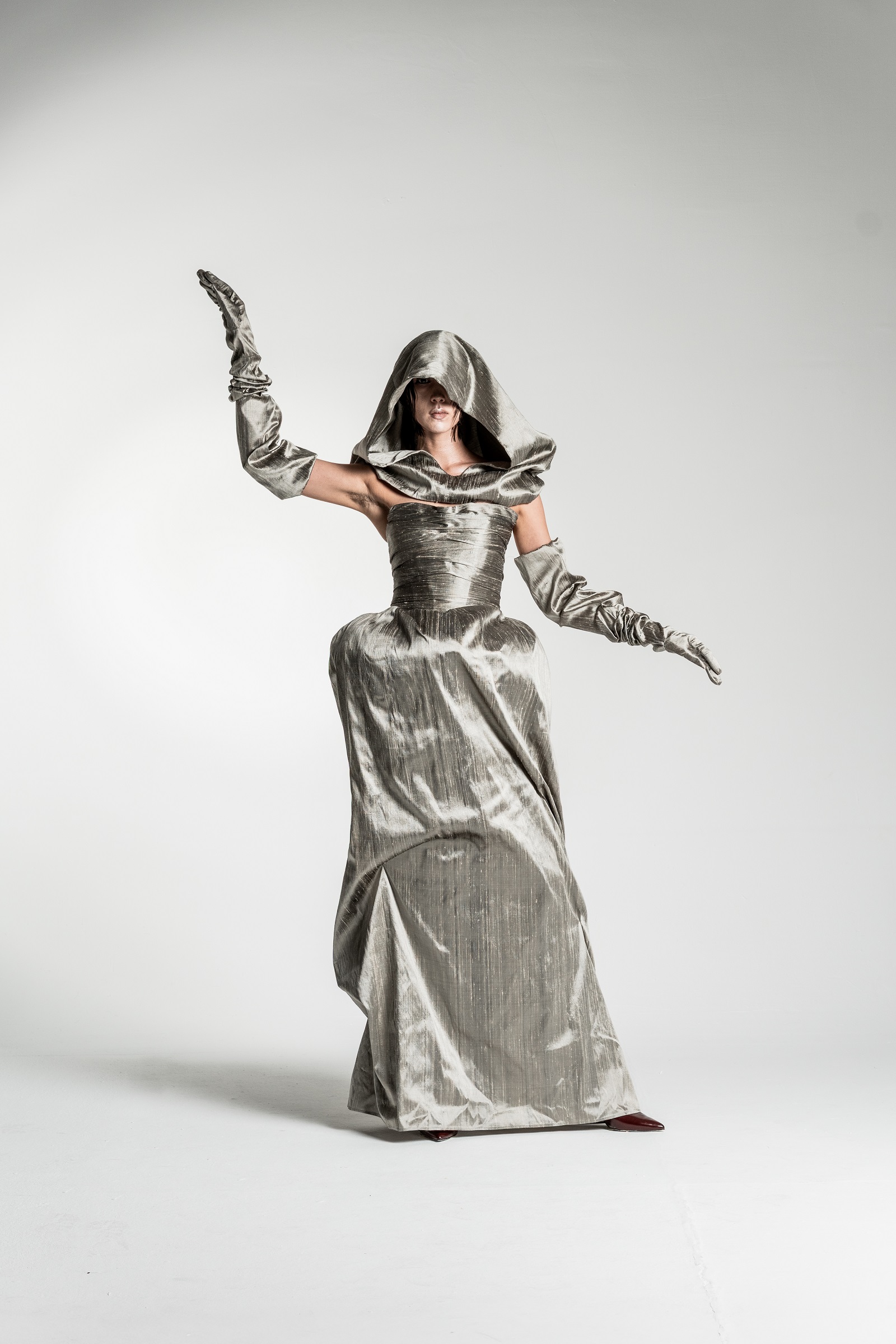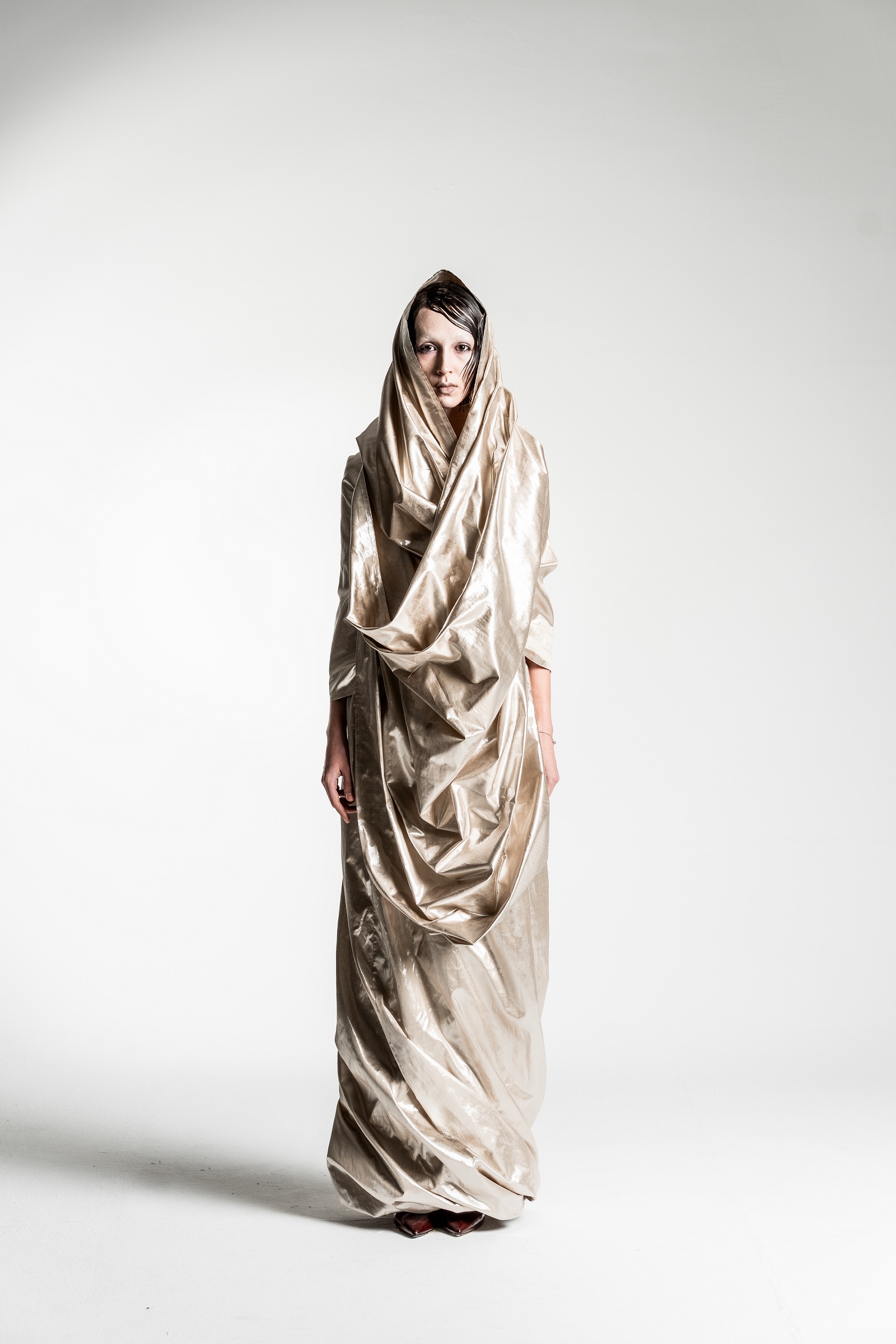 Yes, the collection features a silhouette in silvery-gold tones that is particularly close to my heart and, in a way, best captures the emotional core of the entire project. The shape of this silhouette evokes a cocoon – a symbolic shell that we wear and, at some point, are ready to shed.
