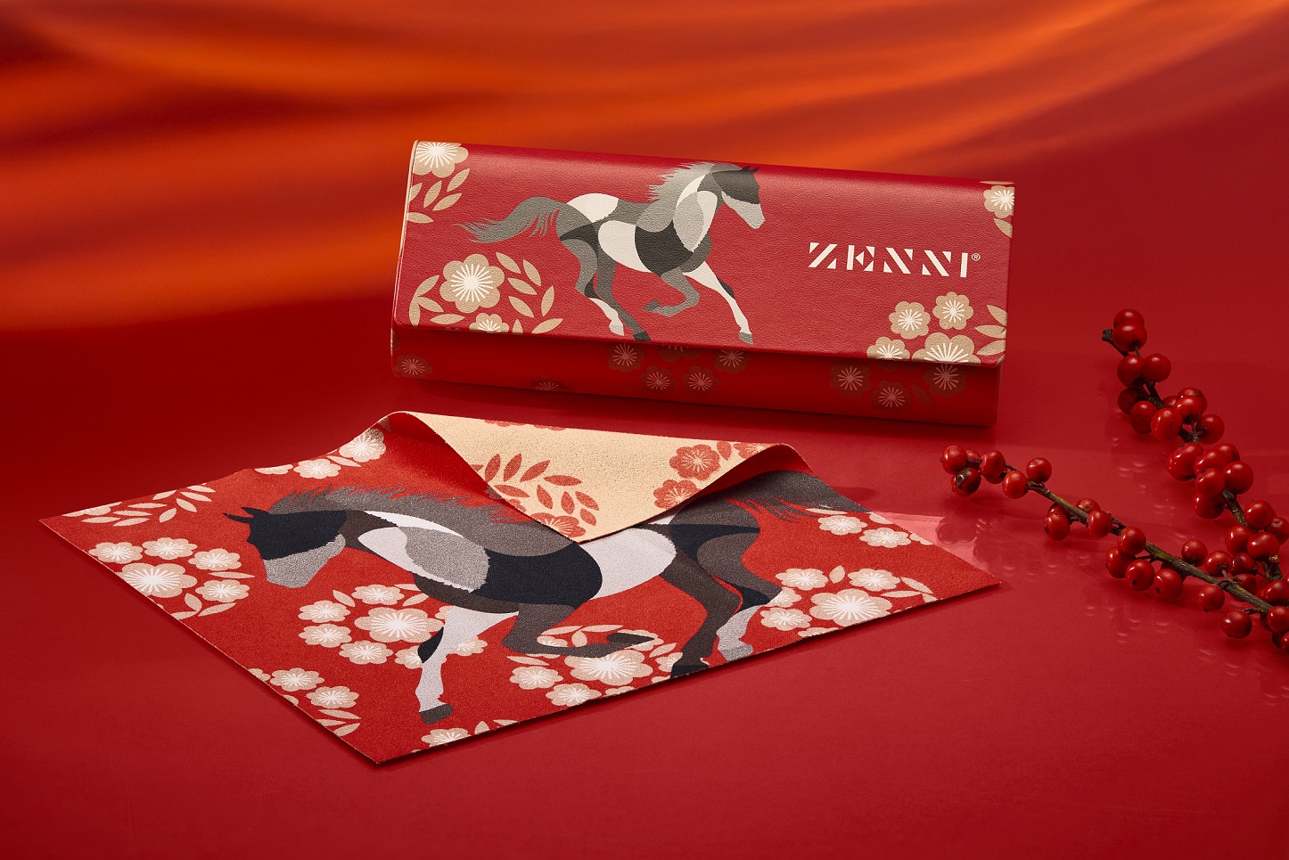 To deepen the storytelling, Zenni partnered with renowned artist Zipeng Zhu, (@zzdesign), to create a limited-edition hard-shell case and lens cloth. Inspired by tradition but elevated to a more contemporary expression  beyond traditional motifs, the artwork reimagines Lunar New Year symbolism through a new lens. The designs pair sharp geometric floral patterns inspired by the classic window decoration with a dynamic and lively horse in mid-stride, inspired by the classical Chinese ink painting, and set against a vibrant red backdrop.